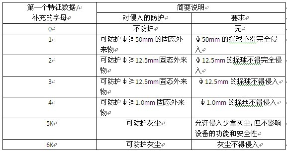 DIN 40050-9 公路車(chē)防護(hù)要求-防塵試驗(yàn)標(biāo)準(zhǔn)中規(guī)定了對(duì)外來(lái)物的防護(hù),要求同樣的防護(hù)級(jí)別(同樣的特征數(shù)據(jù))。在這種情況下,只能用第一個(gè)特征數(shù)據(jù)來(lái)表示這種防護(hù)類(lèi)型。具體內(nèi)容見(jiàn)下表。